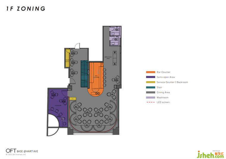 上層的絕對主角還有大面積的LED屏,聚會區(qū)正是由幾塊LED屏圍合而成,酒吧設計作為賽博世界的重要傳播媒介,其靈活多變的特點,對酒吧氛圍場景營造起著關(guān)鍵作用。內(nèi)容素材的更換,可以模糊時間與空間帶來的具體感知,持續(xù)產(chǎn)生新鮮感,為年輕消費者帶來沉浸式的新奇體驗,除此之外,消費互動又影響著新的場景內(nèi)容的產(chǎn)生。
