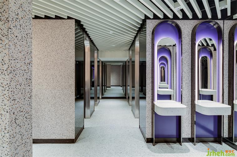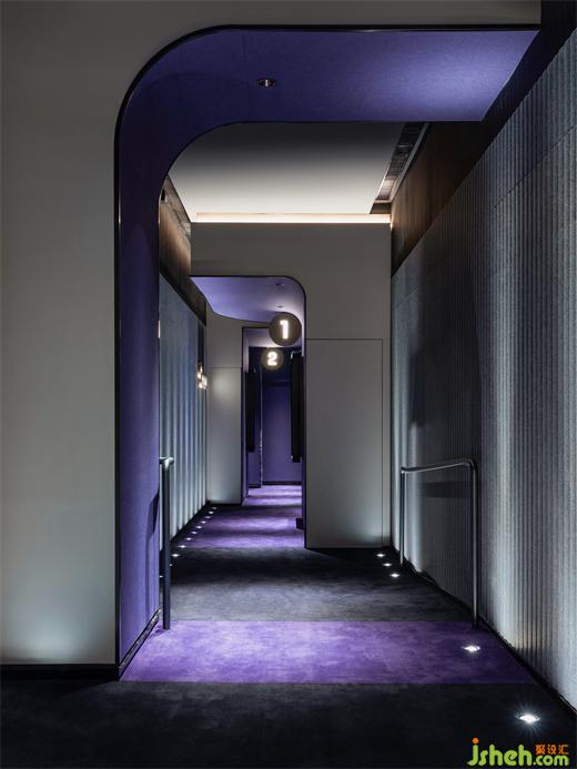 有別于大堂的金屬感,走廊具有讓觀影者互動(dòng)、緩沖的作用,這里的紫色也變得更加柔和,不僅是視覺的焦點(diǎn),更是情感的載體,紫色深沉微妙,充滿情感,可以激發(fā)個(gè)人實(shí)驗(yàn)精神與不墨守成規(guī)的態(tài)度。