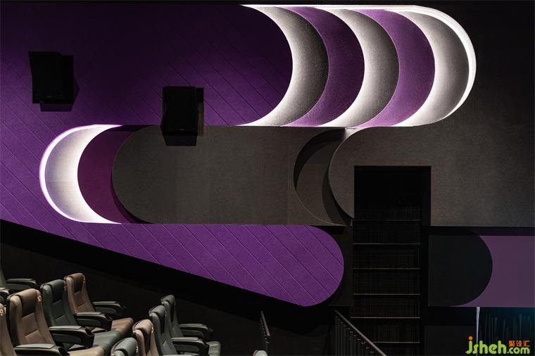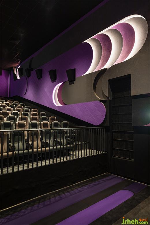 在材質(zhì)選擇上,設(shè)計(jì)師更注重材質(zhì)與色彩的結(jié)合,紫色在玻璃、布藝、精鋼、有色鋁金屬造型等不同材質(zhì)上,電影院設(shè)計(jì)呈現(xiàn)出截然不同的外觀與肌理,為空間帶來更豐富的層次感。