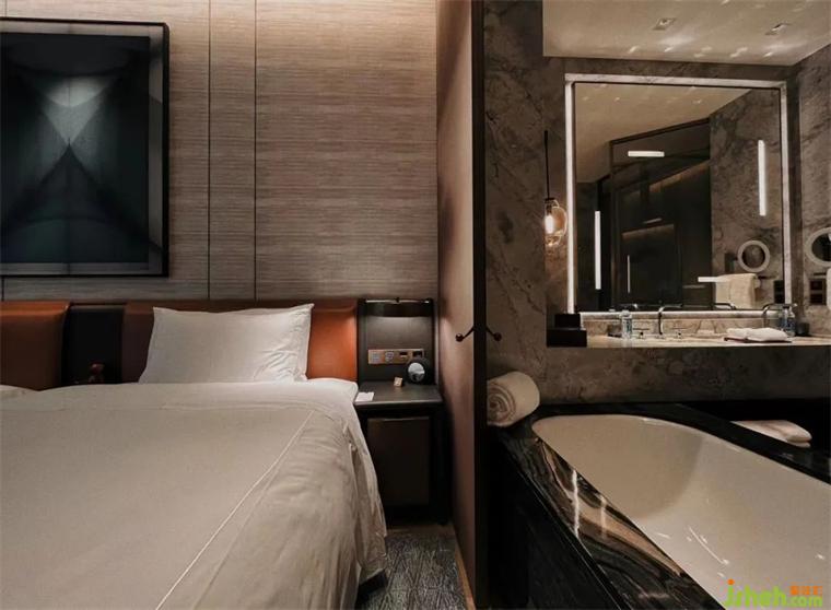 300間典雅奢華客房及套房,擁有花園城市和波瀾海灣景觀,從森系原木地板、中式屏風(fēng)格柵、亞麻針織質(zhì)感背景墻與掛毯,到臥室和浴室間水墨暈染出的美學(xué)連通門,方寸之間無不展現(xiàn)出Yabu鮮明的設(shè)計語言。