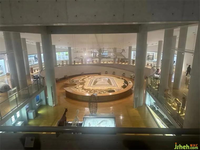 其構(gòu)思是一座小山丘,通過它可以觀覽四周吉蔡文物出土區(qū)域。限預(yù)則形成了一個碩大無朋的合階式廣場,成功的創(chuàng)造出一個人與自然和人與人交流對話的場所。圍繞博物館四周布置了敢步小道,很好的組織了戶外活動。兩組坡道深深明入并穿過廣場上的大臺階。