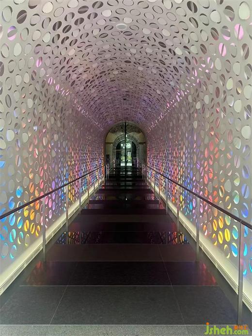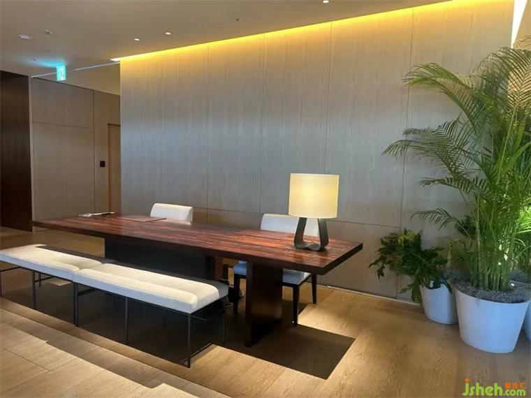 從位于御堂筋大道的主入口進入長長的隧道,客人將立即置身于令人贊嘆的體驗當中:以花朵和精美的折紙藝術為靈感,隧道的金屬內壁上通過激光切割出3000多個圓洞,從背后射入的燈光會隨著四季更替而改變色彩,并在白天和夜晚展現(xiàn)出不同的光照強度。酒店大廳的天花板、地板和樓梯設計均引用了日本的asanoha(麻の葉)紋樣,其中簡潔又大膽的天花板更采用了立體的放大版本,在具有6種灰度的地面上投下倒影。