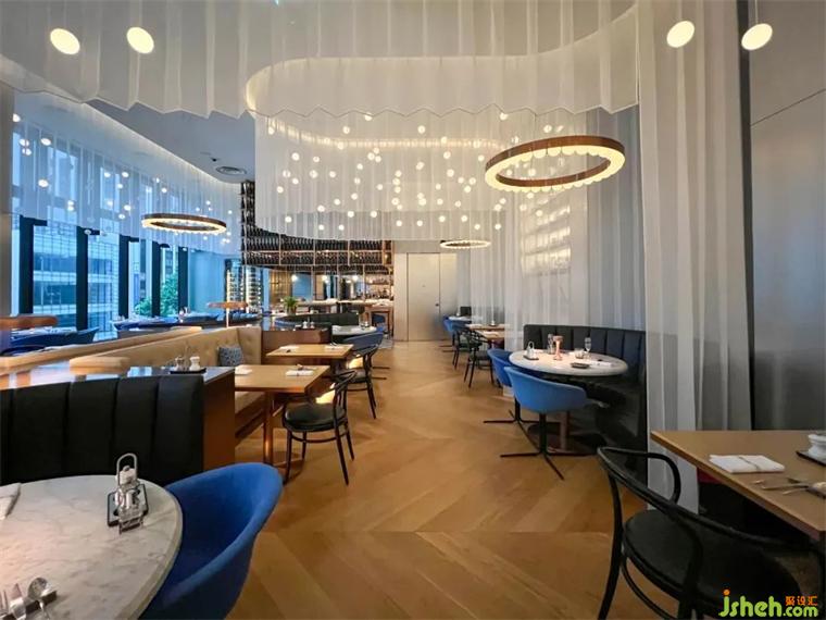與標準的酒店有所不同,客人在進入W酒店的大廳后,首先看到的并不是辦理入住手續(xù)的柜臺,而是作為社交中心的酒吧。白色的透明幕簾結合以顯著的褶皺,如傳統(tǒng)的日式障子一般,以流動的姿態(tài)連接并分隔空間。