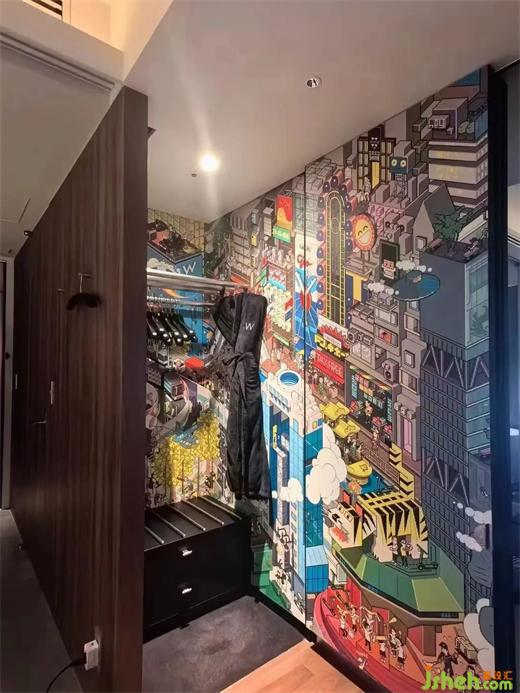 酒店客房擁有櫻花粉和藍色的主題,客人們可以根據自己的愛好來選擇。房間采用開放式布局,客廳、睡眠區(qū)和浴室通過具有現(xiàn)代感的玻璃屏墻隔開,落地窗帶來自然光和城市美景?;疑碾p向鏡面墻隱藏著照明系統(tǒng),在開啟時,房間內將出現(xiàn)粉色或藍色的斜向燈帶,讓人聯(lián)想到大阪夜里亮起的霓虹燈。另一個“驚喜”被隱藏在衣柜的胡桃木門后:來自eBoy的平面設計師們特別為客房創(chuàng)作了大阪的“像素地圖”,以繽紛的色彩描繪出大阪的著名地標和景點。