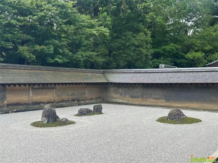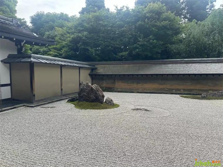 在約 250 平方米的空間里,15 塊大小各異的石頭鑲嵌在白色的沙子上,布局看似簡(jiǎn)單,卻富含深意且充滿(mǎn)謎團(tuán)。有人說(shuō)它表示海中的小島或云海中的山巒,有人則認(rèn)為是一只雌虎帶著幼虎渡河。就像一個(gè)直觀的禪宗謎題,它取決于觀眾自己的詮釋和想象。