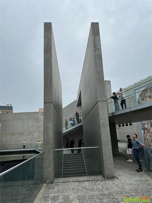 清水混凝土、水 、陶板畫(huà)是整個(gè)建筑中出現(xiàn)得最多的元素,他們各自承擔(dān)了不同的職能,卻又相互融合、搭配,缺一不可。清水混凝土作為支撐結(jié)構(gòu)及外維護(hù)結(jié)構(gòu)材料,其出現(xiàn)的結(jié)構(gòu)意義被縮小,取而代之的是其對(duì)于空間及視線的限定。這樣的處理方式使得用地在有限的范圍內(nèi)產(chǎn)生了多個(gè)處于并置關(guān)系的空間,并增加了陶板畫(huà)相互融通卻又相對(duì)獨(dú)立的展陳位置。