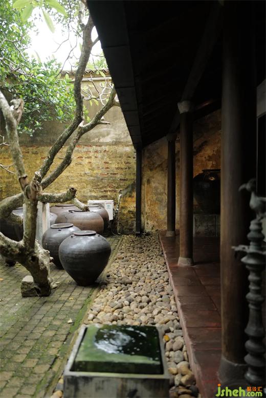 狹長空間橫向局促,通常會盡量避免在橫向上做復(fù)雜設(shè)計(jì),但巴瓦偏偏在橫向上設(shè)置了多重空間,中心庭院實(shí)際上有三個(gè)并列的小庭,中間是水庭,兩側(cè)分別是帶有壁龕的休憩庭和裝飾著雕塑的景庭;水池邊的廊柱不是兩排而是三排,其作用不僅界定空間,還增加了景深;站在任何一側(cè),都能看到廊柱、水池、屋檐、地面構(gòu)成的多層畫面;想象雨天坐在壁龕的沙發(fā)里,屋檐落下雨幕,該是怎樣動人的景致啊。裝修設(shè)計(jì)