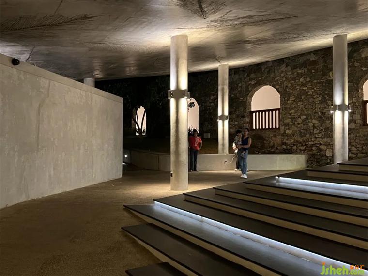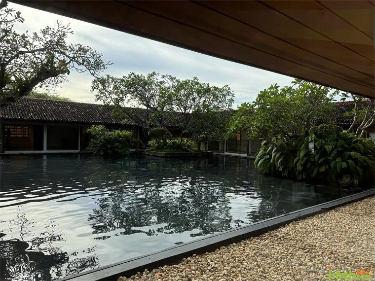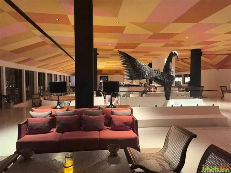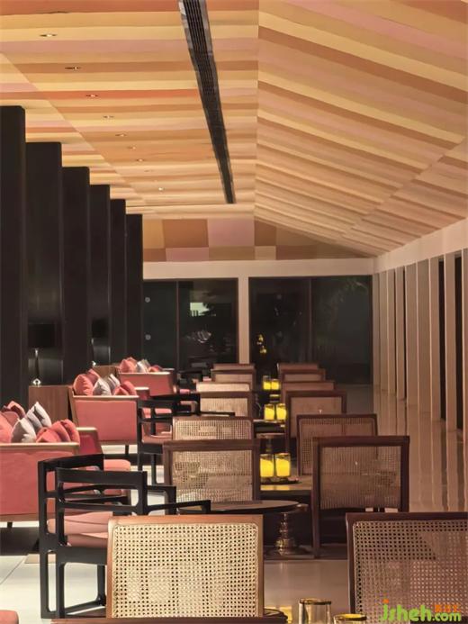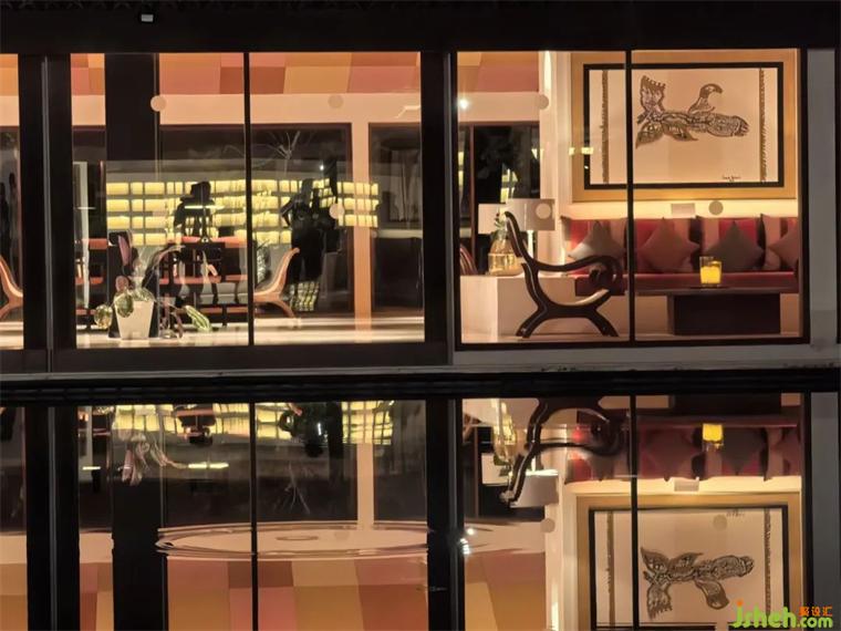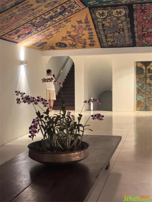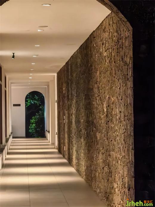基座層是由毛石砌筑而成的“堡壘”,內(nèi)部空間有種厚實的洞穴感。二層是以四面圍合的水庭院為中心的公共區(qū)域,這一層的陳設(shè)設(shè)計得非常適度,繁復(fù)而不油膩。三層往上則是層層向外懸挑的客房區(qū)域,舉重若輕地漂浮。裝修設(shè)計