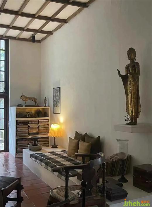 我喜歡把只有屋頂、沒(méi)有外墻和門(mén)窗的空間叫做“灰空間”,而巴瓦的建筑,除了臥室和客房以外,幾乎全都可以稱(chēng)作“灰空間”。事實(shí)上他的科倫坡自宅的主臥室也可以算某種程度上的灰空間。他在盡力消除人居空間與自然之間的阻隔。這些充滿(mǎn)熱帶魅力的空間當(dāng)然是根據(jù)斯里蘭卡的氣候條件(常年 25 到 30 出頭的氣溫、雨季旱季分明)定制的,裝修設(shè)計(jì)也是他所處的時(shí)間空間條件(空調(diào)不普及、斯里蘭卡電力緊張。事實(shí)上直到現(xiàn)在斯里蘭卡空調(diào)的普及率仍然不高)所決定的。