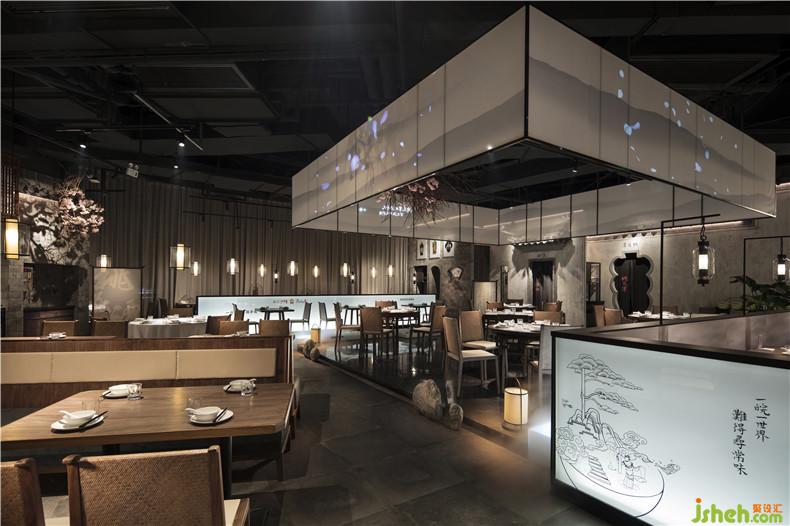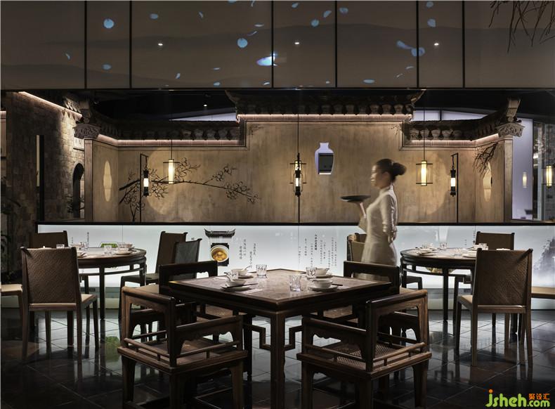 作品簡(jiǎn)介:皖廚桃花潭外立面運(yùn)用整面玻璃燈光外墻,國(guó)畫(huà)寫(xiě)意結(jié)合現(xiàn)代燈光設(shè)計(jì),繪制抽象徽派建筑線條。餐廳內(nèi)沿用徽派建筑馬頭墻墻體,并于高地懸掛紗幔以聲光電技術(shù)投影桃花瓣飄落場(chǎng)景,室內(nèi)多以中式園林框景手法結(jié)合燈光設(shè)計(jì)繪制陰翳感,金磚地面營(yíng)造出水的倒影,拉伸空間的維度。