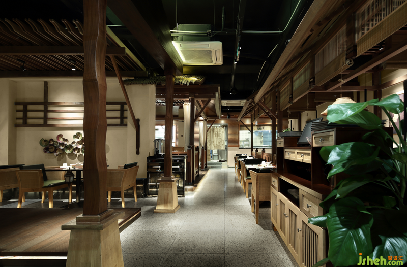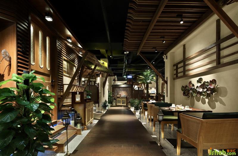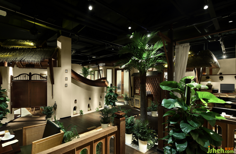 綠色植物點綴其中,原木質(zhì)感的村落營造東南亞風情本餐廳,開敞式設計,獨特的東南亞小木屋配合綠植色彩營造獨特的異域風情,非常不錯的餐廳設計!