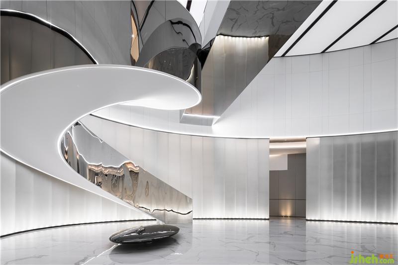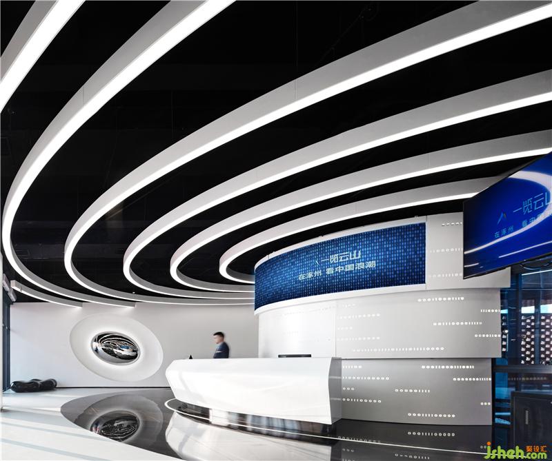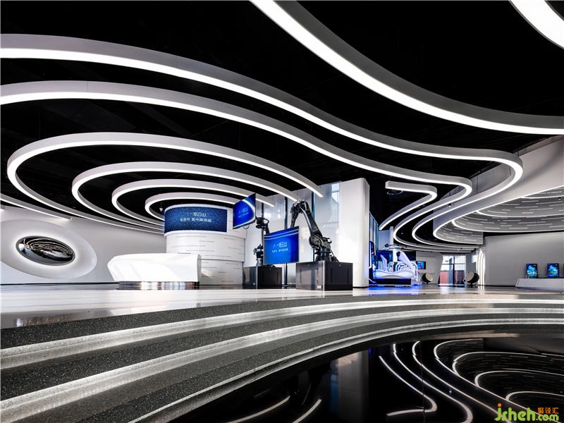 設(shè)計(jì)團(tuán)隊(duì)以科技未來感之折線作為設(shè)計(jì)元素,打造科技館式,體驗(yàn)式的營銷中心;以高科技為主軸,融入VR體驗(yàn)、3D幻影城市、全息投影、機(jī)械臂等技術(shù)和扎哈風(fēng)格的場景,營造科技與未來的視聽盛宴。