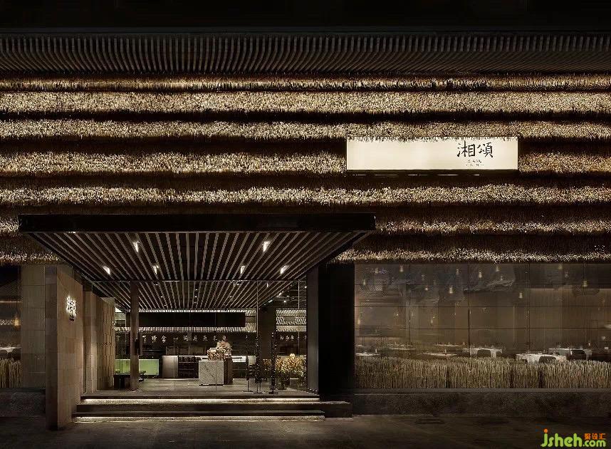 餐廳外立面創(chuàng)意性地運(yùn)用成千上萬的“鋁制稻草”整齊排列,通過充滿陣列感的鋪陳營建秩序,模擬和優(yōu)化稻草的視覺效果,予人從繁華都市到金黃稻田的場景切換。美觀之外,同時還解決了無法通過消防、較難布置、有蟲患等等諸多問題。